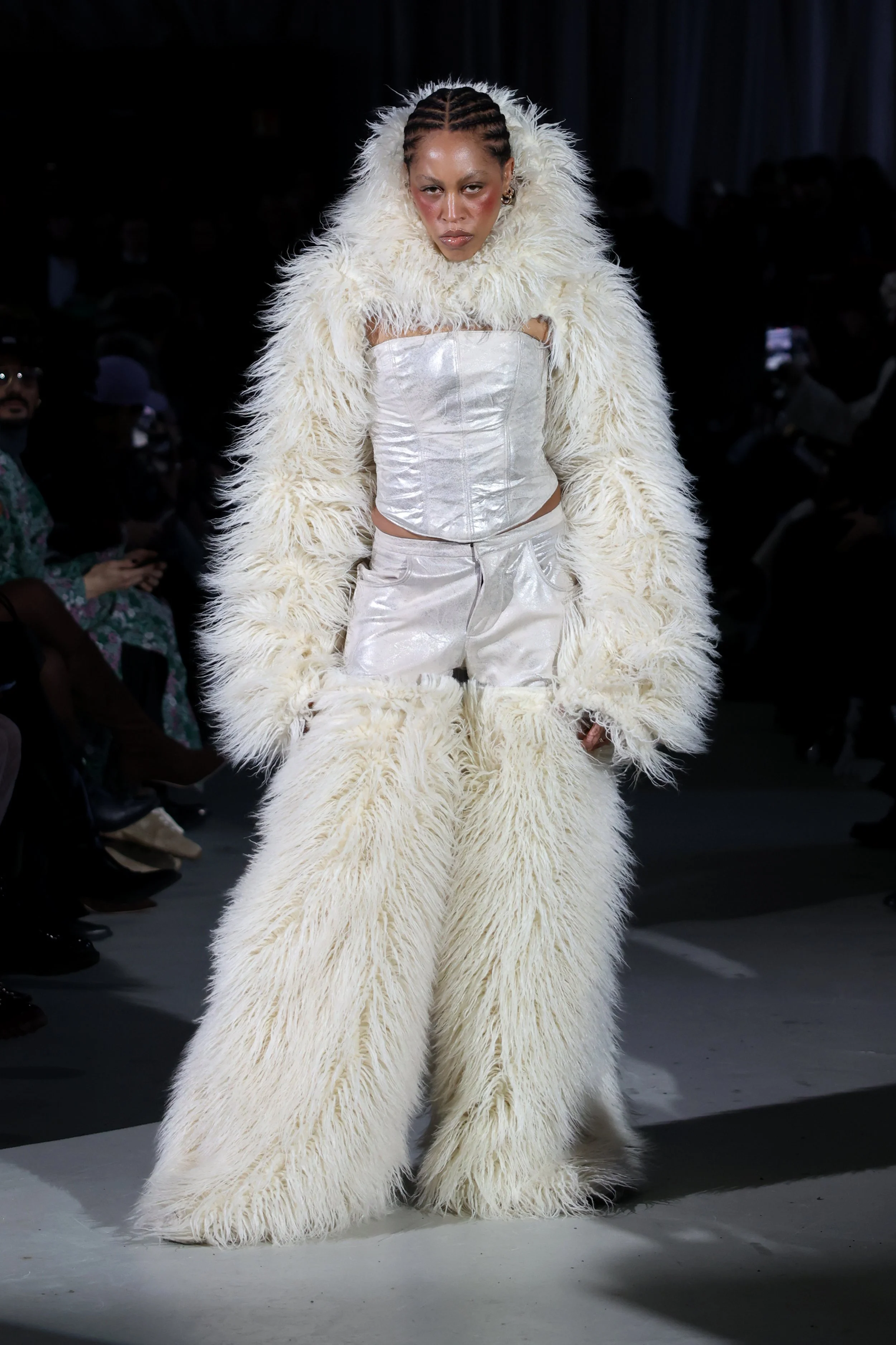 Model Jazz Ameinah brought immediate energy to the show, wearing a white fur hooded bolero, a white metallic corset, and white fur bottoms to coordinate, all bouncing with every step.