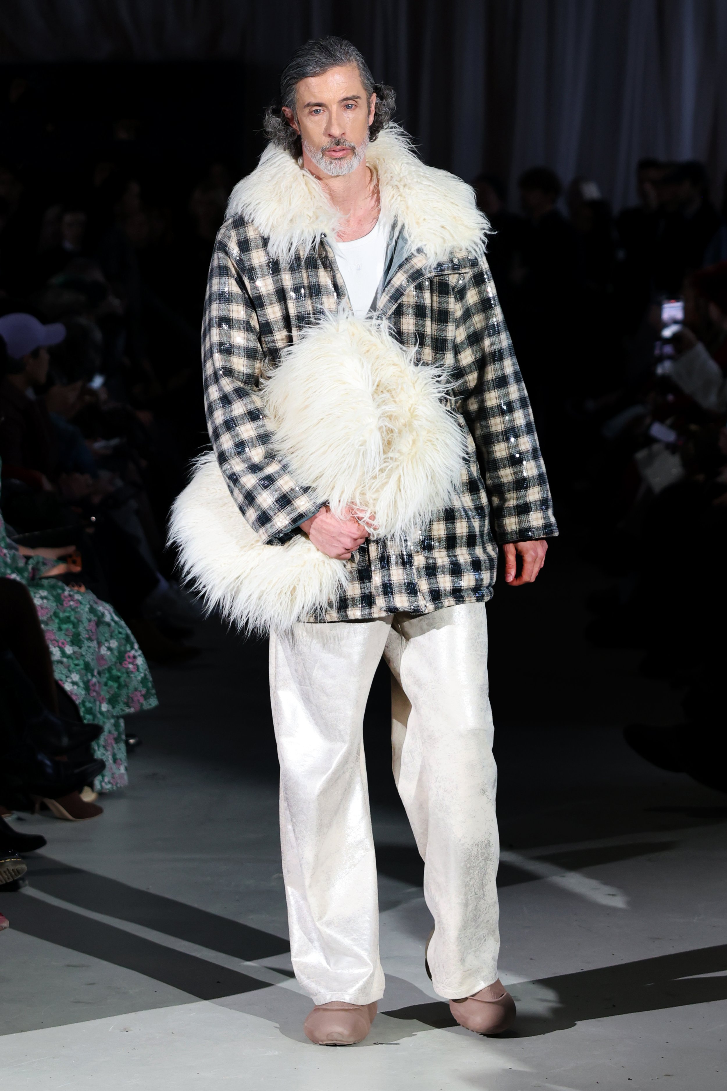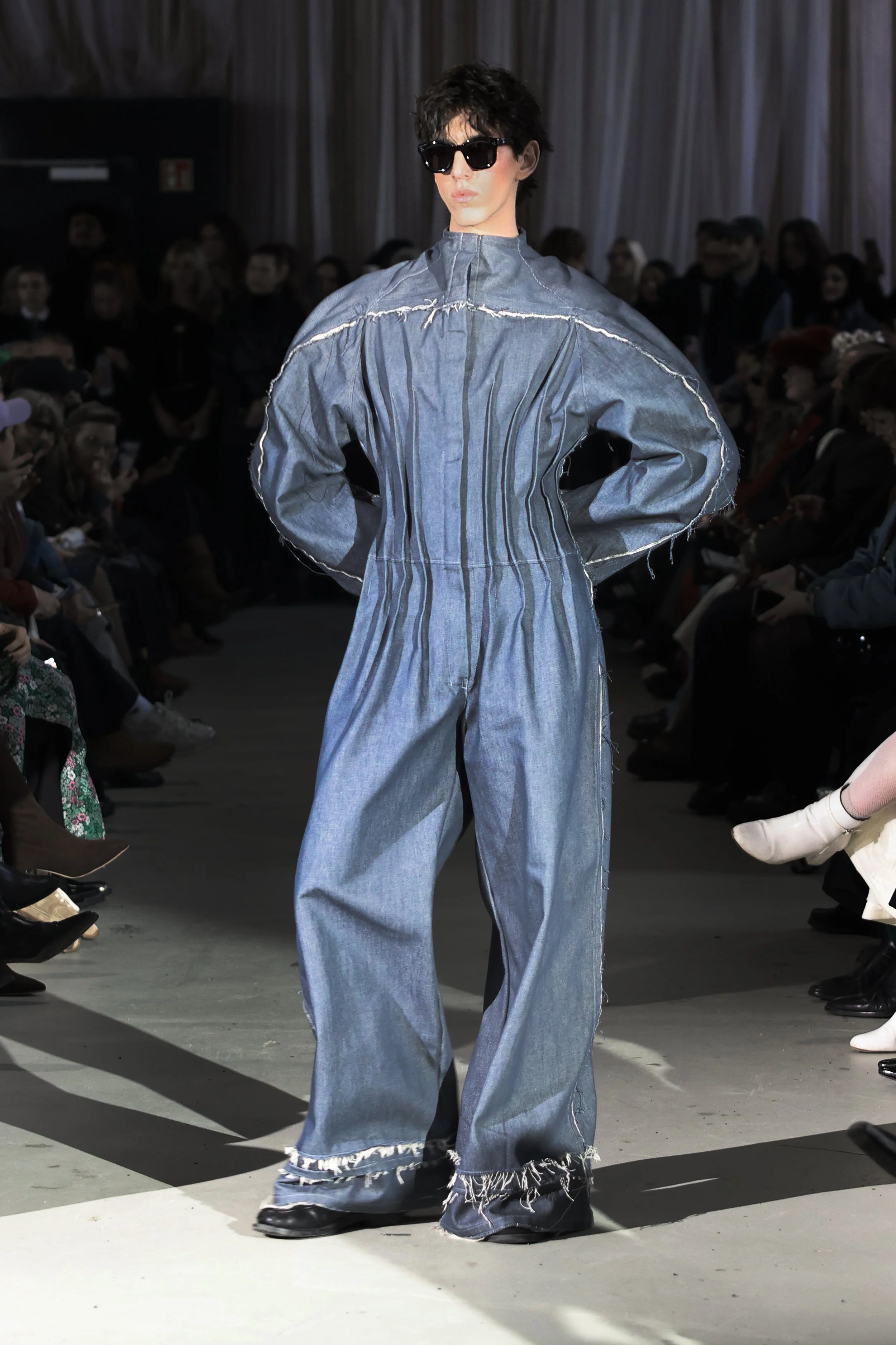 Production was minimal, likely to focus on the garments at hand. As the music progressed, so did the looks. For example, Look 4 jumps from a workwear-meets-couture denim pleated jumpsuit, to Look 5, a sweatpants suit decorated with exaggerated, fur square structures protruding from the shoulders.