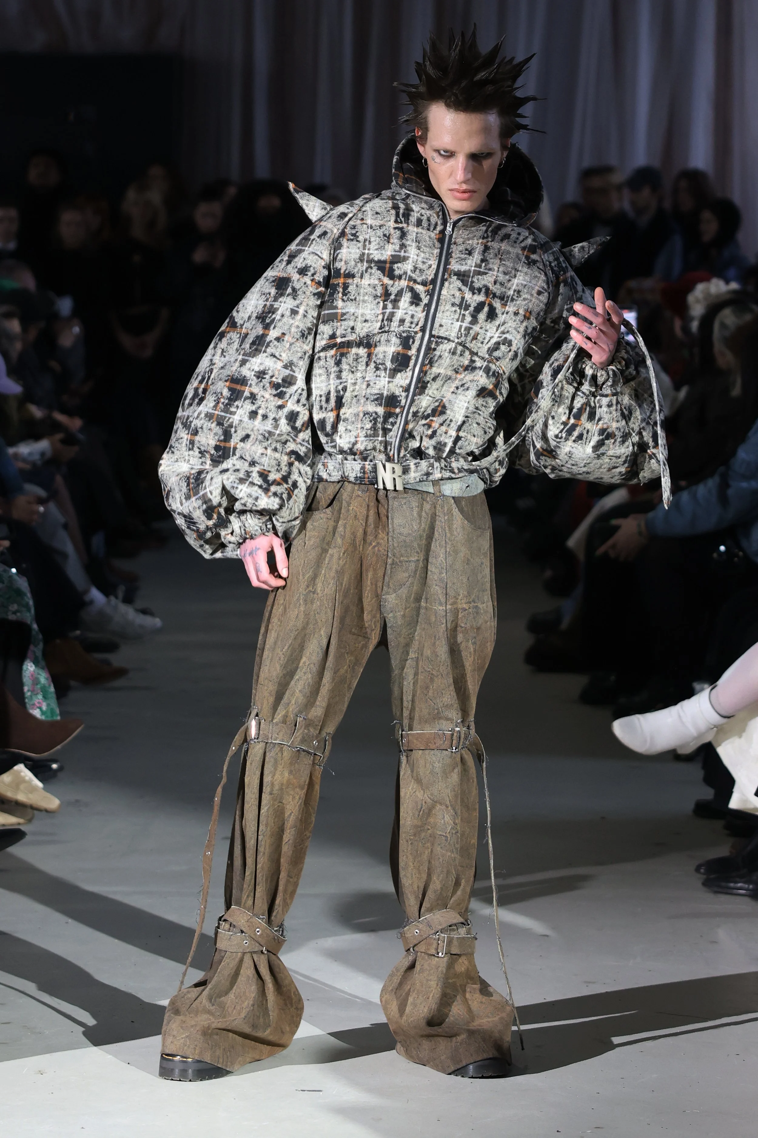 When model Nino Bar came out in an elevated punk look, complete with liberty spikes in his hair, and a tweed-inspired puffer with spikes across the back, the music also transformed the energy on the runway–– from drill to rock.