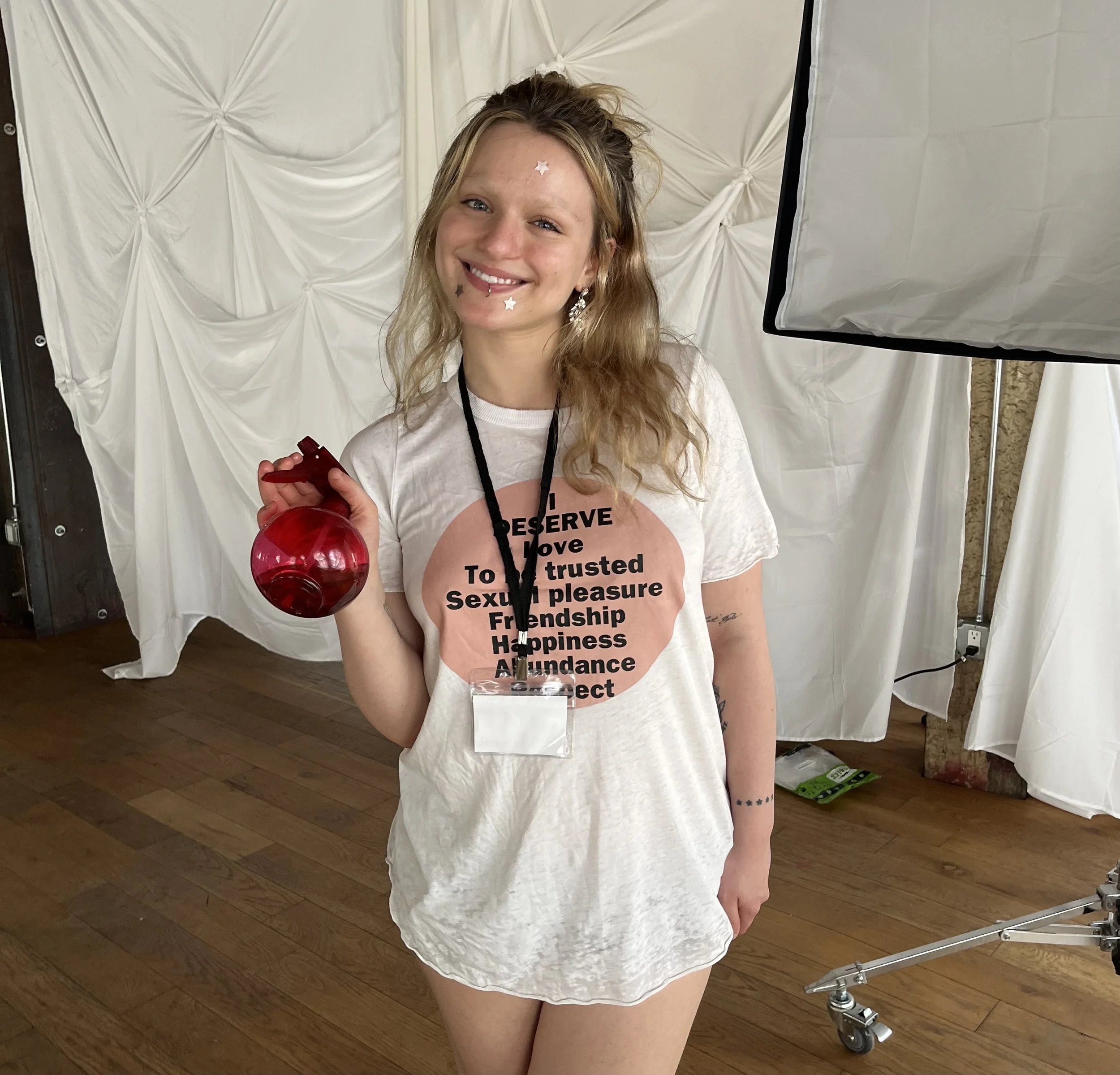 Sydney Wekstein, the designer and creative director of World Of My Own (WOMO) arrived on the morning of her SS25 fashion show having just freshly bleached her eyebrows on the Uber ride over. She wore a sheer lace bodysuit and jeans so baggy they hardly stayed up, with StarFace stickers on her face and iridescent under-eye masks.