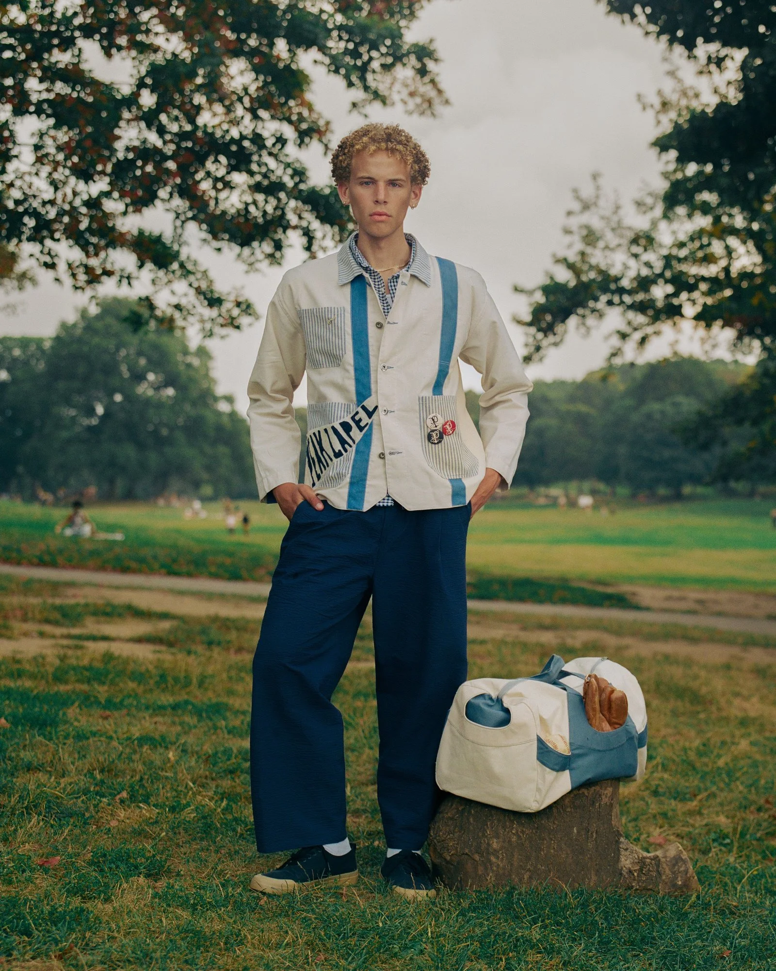 Founded by Parsons students Ben Stedman and Jack Milkes, this traditional unisex label combines preppy signatures with historic silhouettes to create pieces that can be worn from work to a night out. Having debuted at last season’s men’s day, this season’s looks were full of “vintage preppy” pieces, looks that can be lived in, whether it’s a day in the park or a night out. Some of our favorite pieces included tailored gingham pants, a blue knit sweater tied effortlessly around the neck, and a white jean jacket accented with striped pockets, blue strips of fabric, and a namesake patch across the side. There were also matching bags and props such as picnic blankets, sports equipment, and suitcases, transporting viewers into the retro-modern world of Peak Lapel.