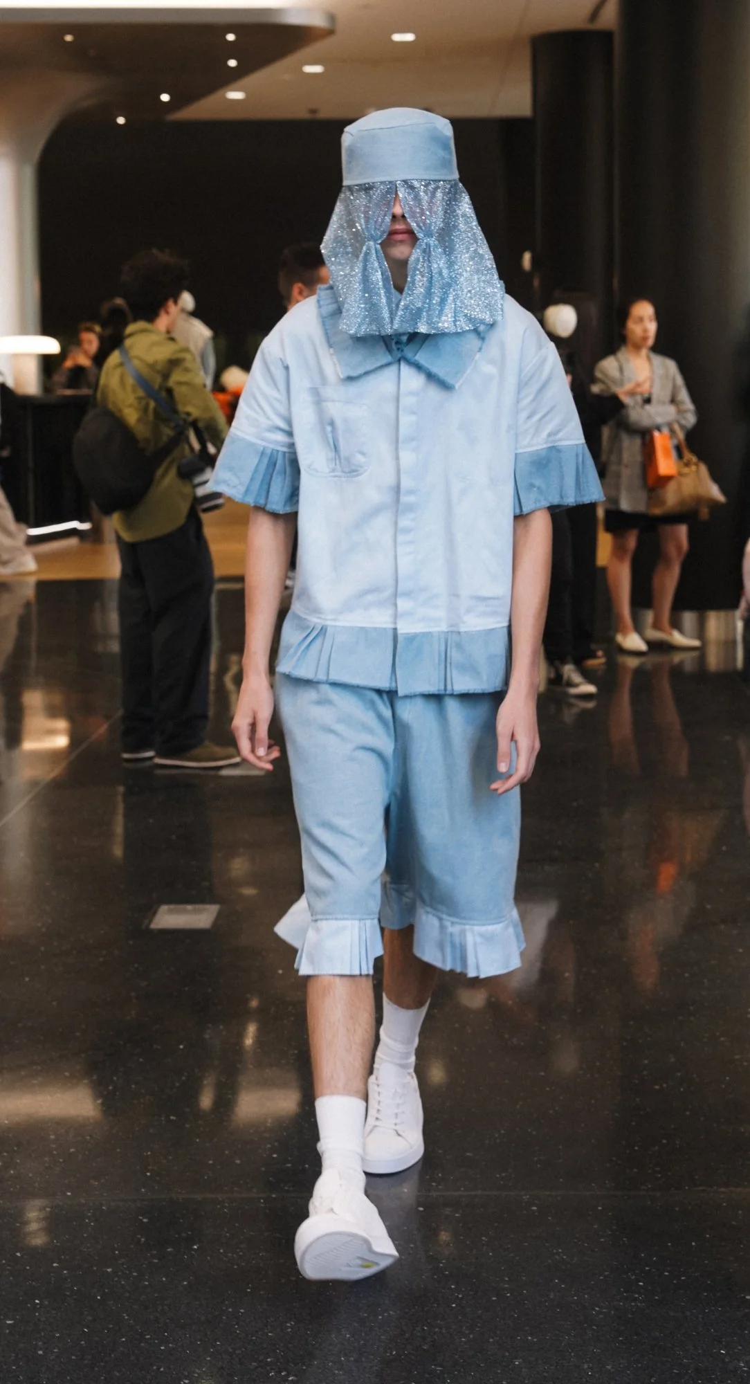 The namesake South Korean designer was inspired to create this collection by her own repetitive thoughts. This manifested itself in repeating patterns such as stripes and pleats. The set reflected this as well, being a mimic of Son’s bedroom. Standout looks included a slightly bunched beige ensemble with a ruffled bonnet, a light blue button-down shirt with ruffles on the sleeves paired with matching ruffle capris and a silk hat with a glittery curtain, and a sheer top with draping and bows paired with wide-leg textured pants.