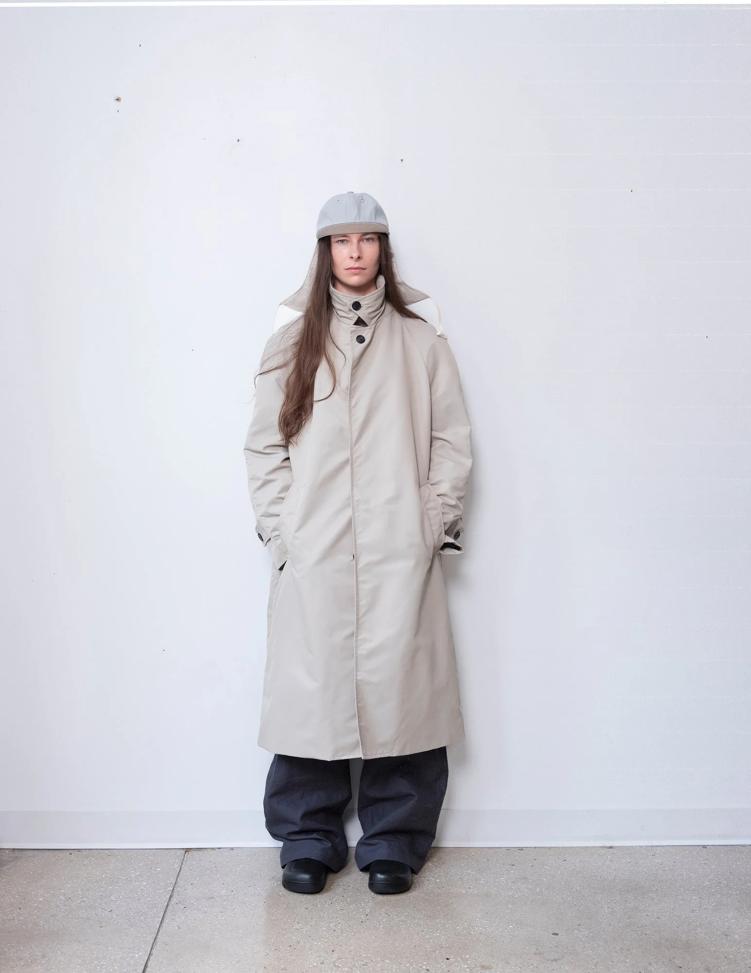 The New York City-based label, founded by designer Mark Smith, had one of the most entertaining and interactive presentations, featuring a modern wooden rotating platform on which each model would stand. In contrast, the other models would push it around. This collection featured worn and neutral-toned fabrics sourced from niche Japanese mills. Stand-out looks included a long trench coat paired with tailored grey slacks, an oversized navy long-sleeve top with pink shorts and high-rise socks, and a casual brown button-down with khaki slacks and a matching hat.
